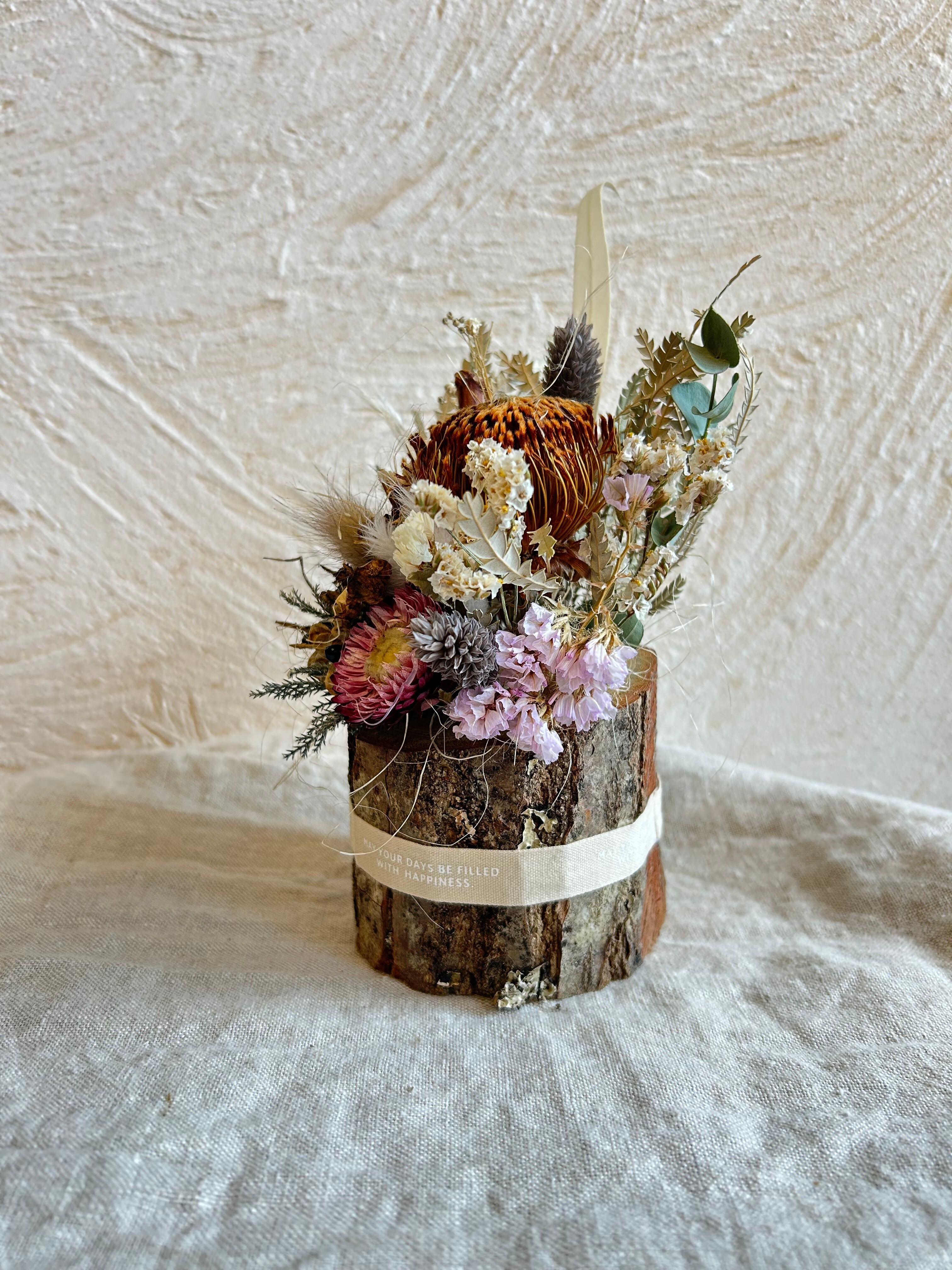 コヒバ・ソーラーフラワー・スターチス・ラグラス・ユーカリ・かすみ草・サマーチェリー・ヘリクリサム・ボアプランツ・リューカデンドロン・ユーカリウィロー・ヒオウギ・ジュート・カーリーポッドナチュラル・切り株・リボン